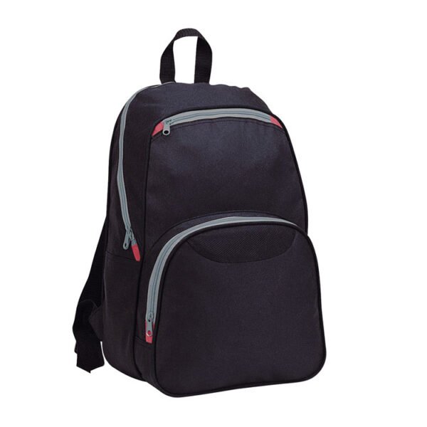 Nice black polyester backpack with coloured zipper and two extra front compartments with strap. We will print your logo on the front.