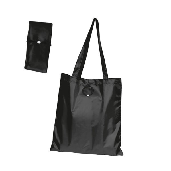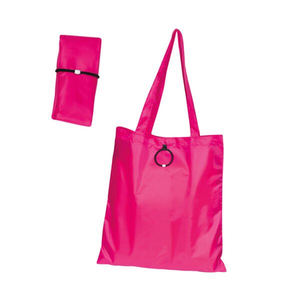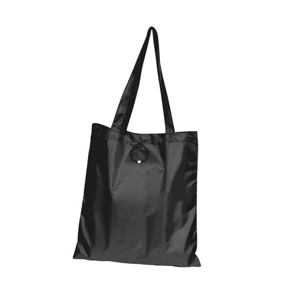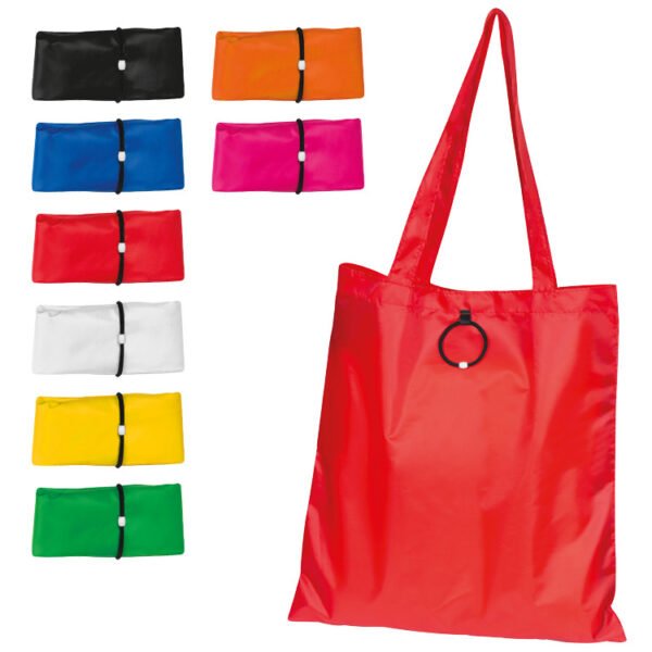 Foldable shopping bag in 190T polyester with carrying handles and a rubber band for closing. We print your advertising on the front. The bag is delivered unfolded.