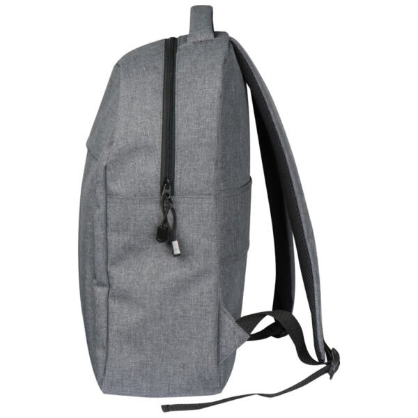 600D polyester backpack, with black zippers and front compartment. The main compartment is ideal for carrying laptops or notebooks. We will print your logo on the front.