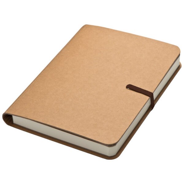 Notebook with rubber band for closing, 120 lined pages and extra compartment. We will print your advertising on the natural coloured cover.