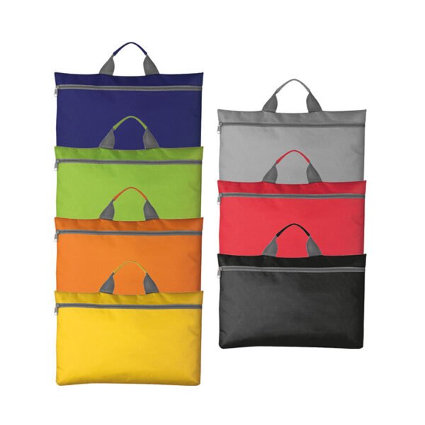 Conference bag made of sturdy polyester with zipper and handle. We will print your logo on the front.